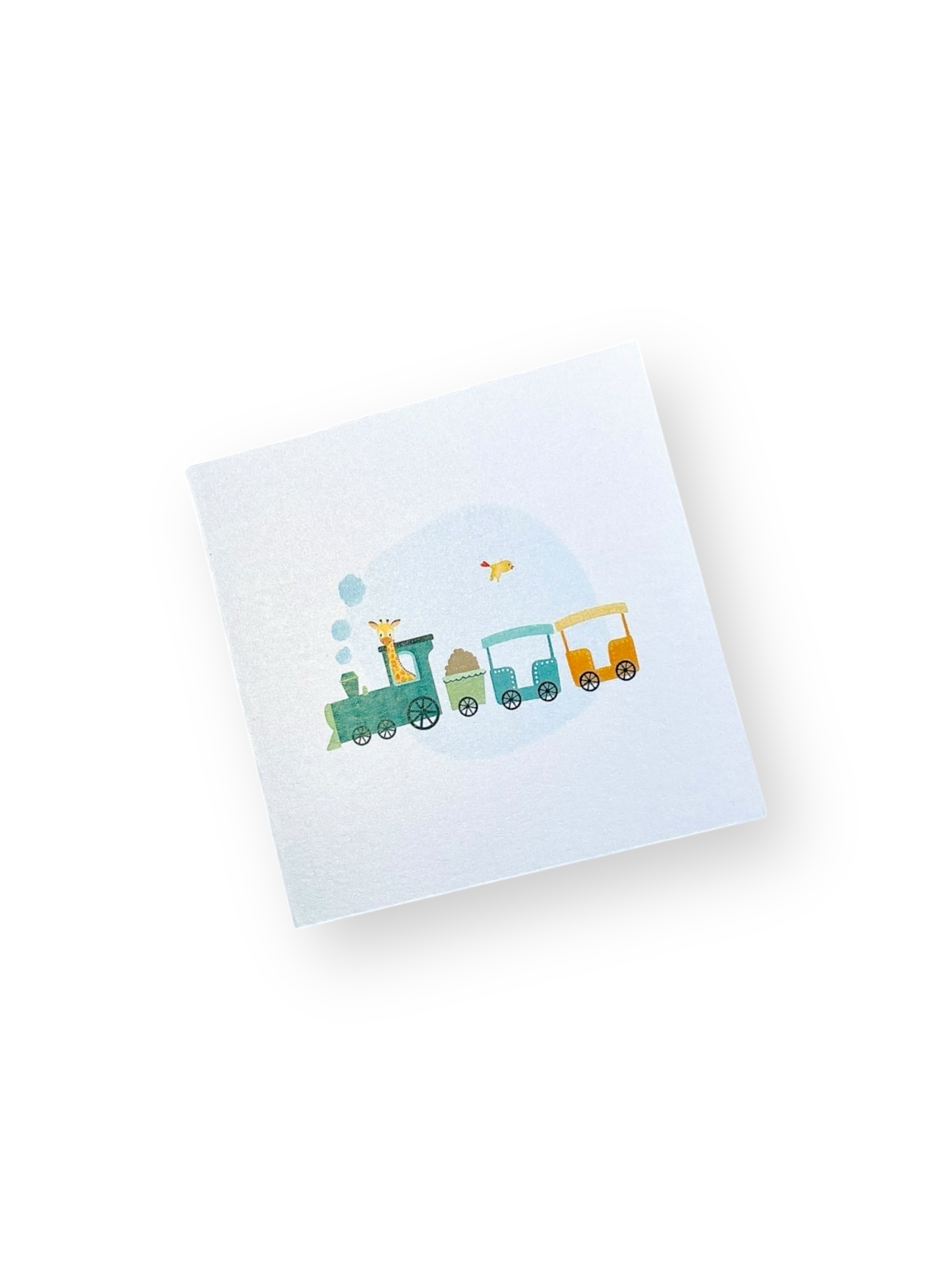 This delightful greeting card features a colorful illustration of a cheerful toy train.