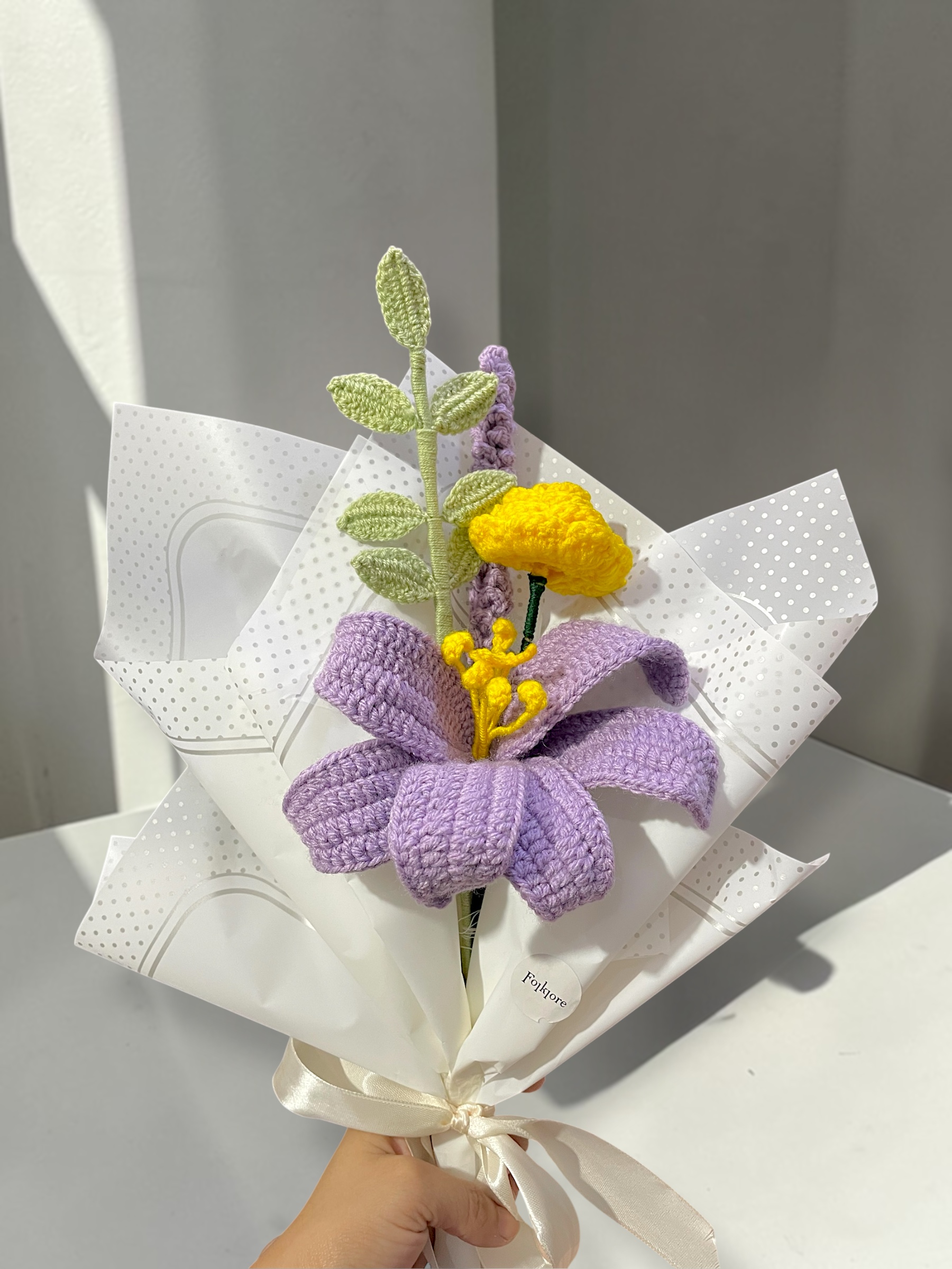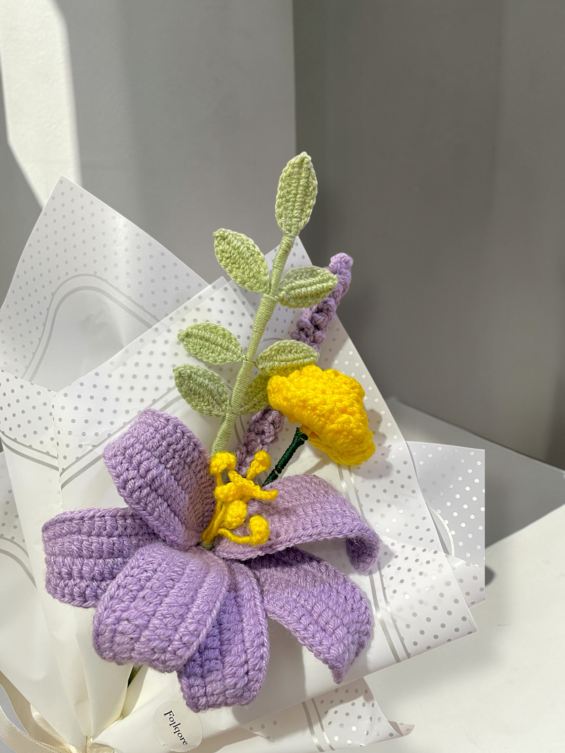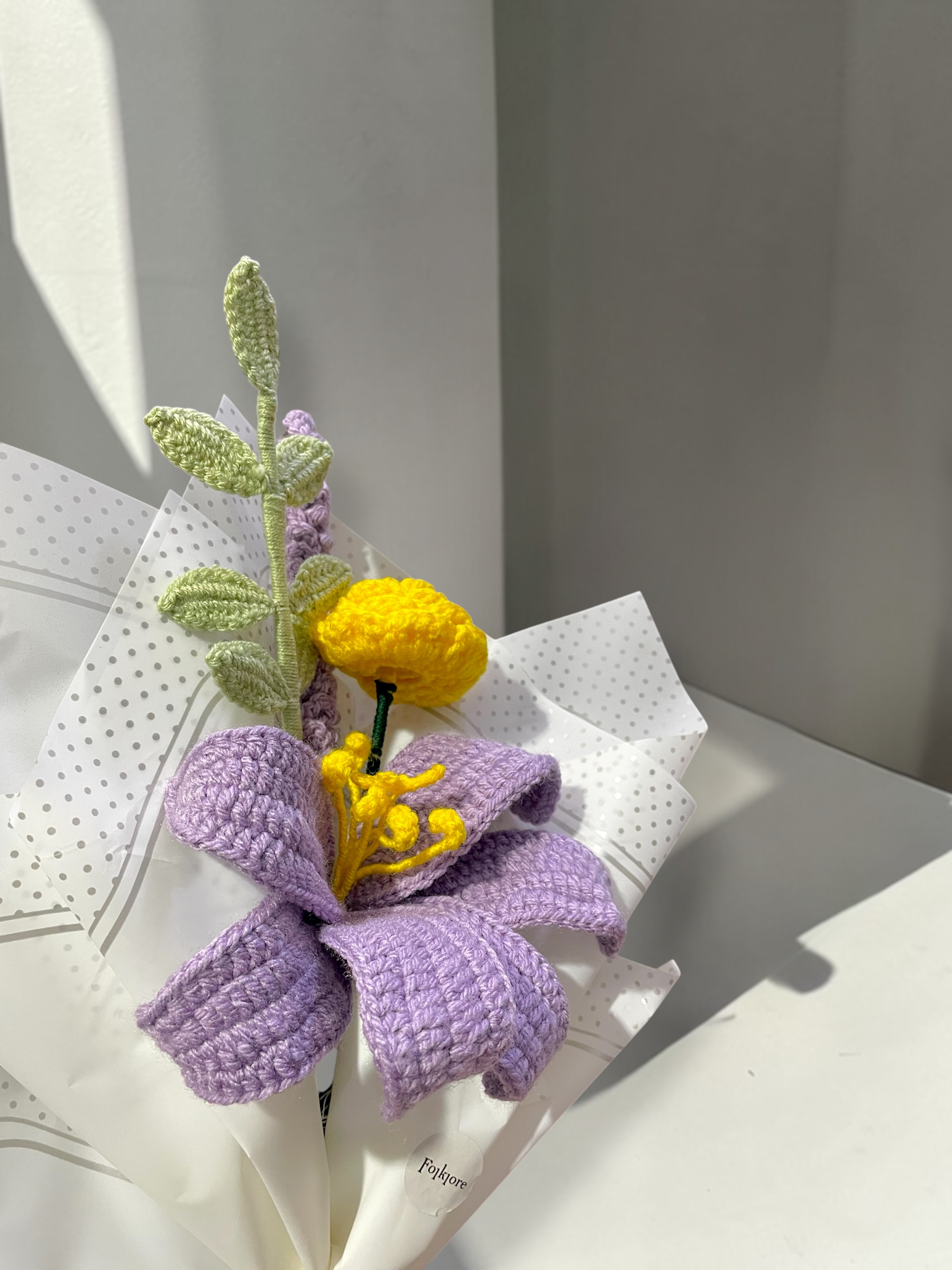 This charming handmade crochet bouquet features a vibrant purple lily flower with yellow stamens, paired with a delicate yellow rose and lush green leaves. Wrapped in elegant white paper with a dotted pattern and tied with a satin ribbon, it’s a timeless arrangement that captures the beauty of nature through artistry. Perfect for gifting or decoration, this bouquet symbolizes creativity, warmth, and heartfelt craftsmanship.