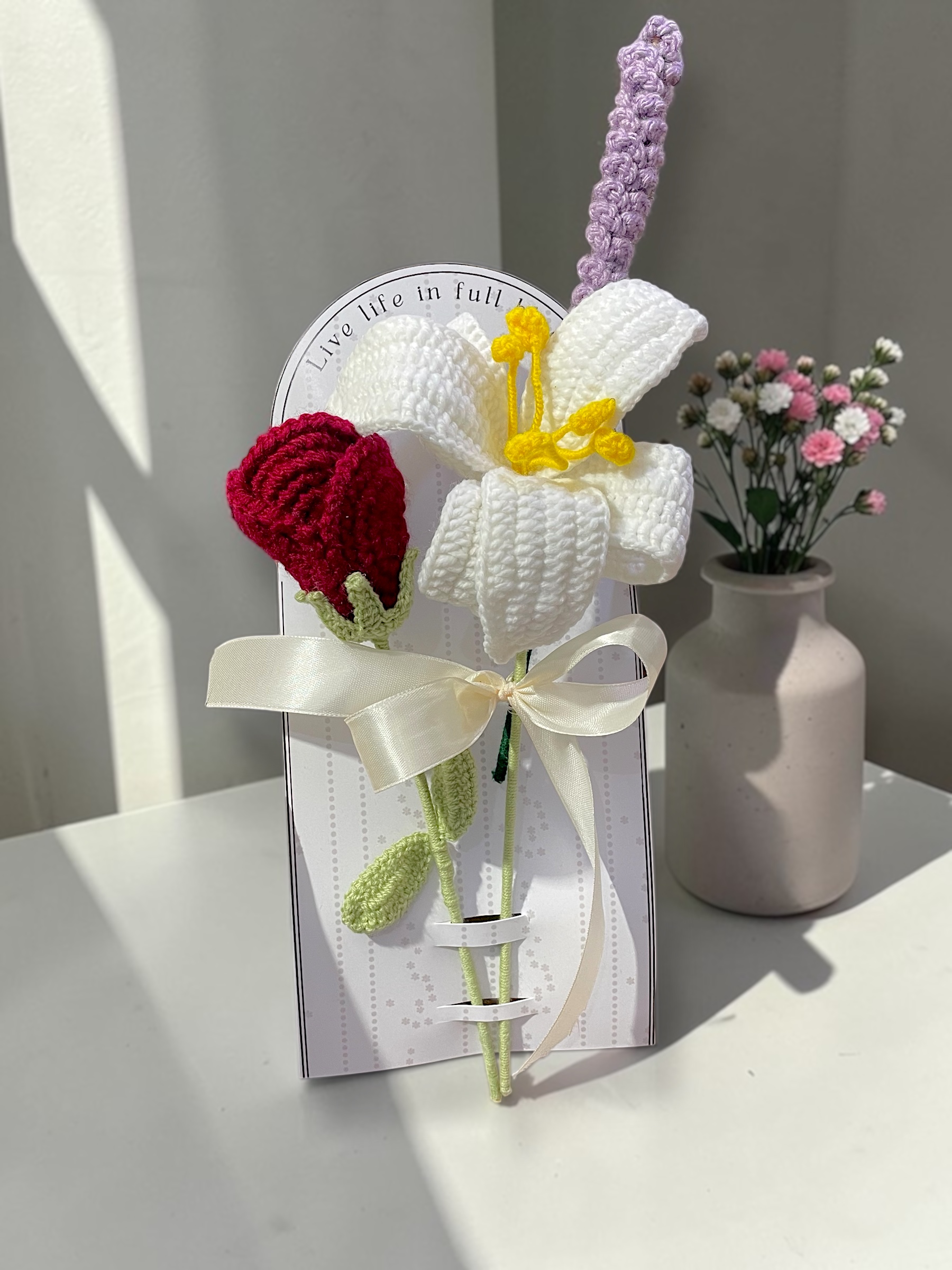 This exquisite handmade crochet bouquet features a trio of blooms—a deep red rose, a delicate white lily, and a lavender spike flower—beautifully arranged on a white card and tied with a cream satin ribbon. Each flower is carefully stitched with intricate detail, symbolizing love, purity, and grace. Perfect for gifting or display, this bouquet blends artistry with sentiment, offering a timeless keepsake that never fades.