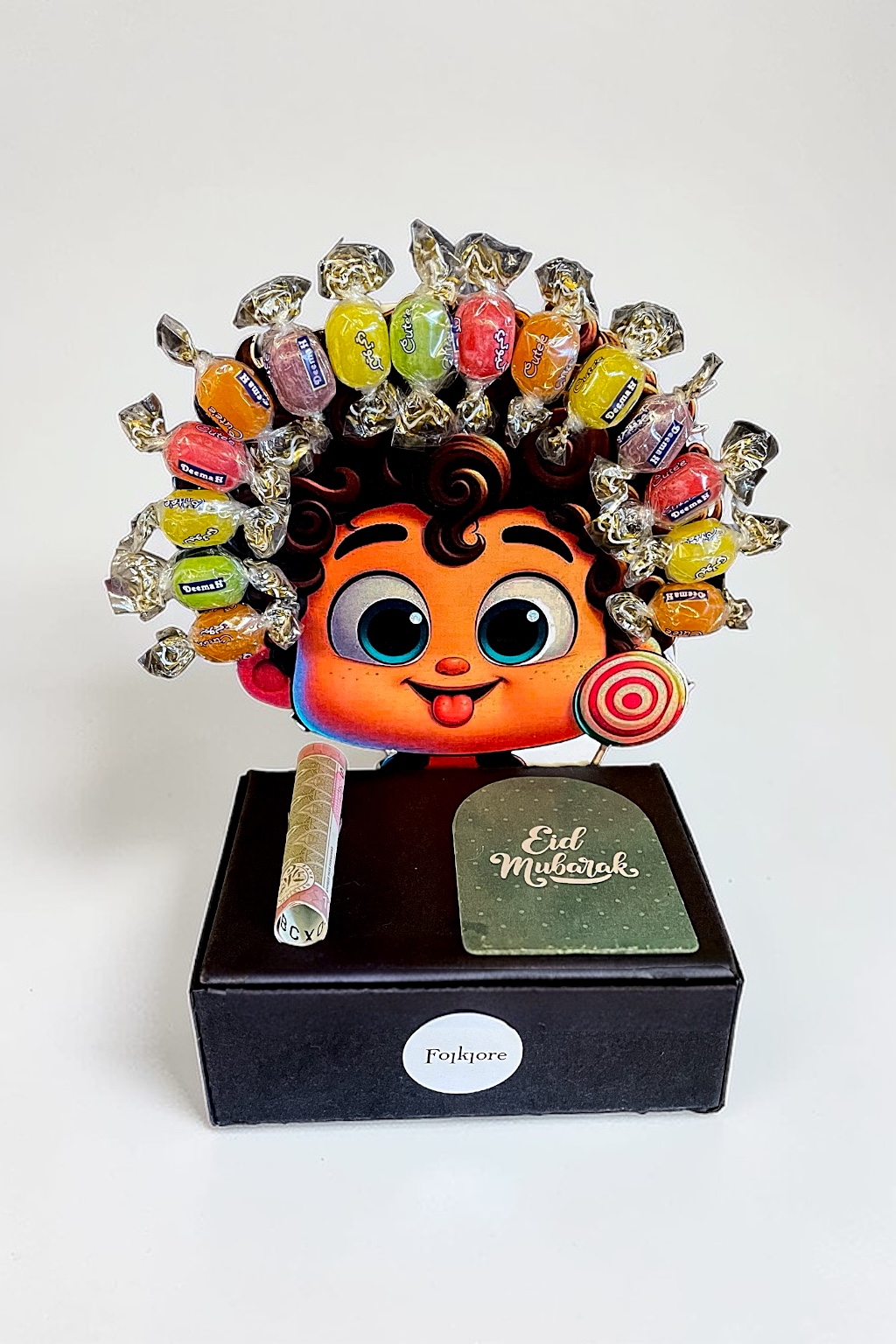 Celebrate Eid with a burst of sweetness and charm. Joy Bloom features a cheerful cartoon face framed by a halo of vibrant candies, perched atop a sleek black box. Complete with a rolled currency note and a mint “Eid Mubarak” card, this handcrafted arrangement blends tradition with playful elegance.