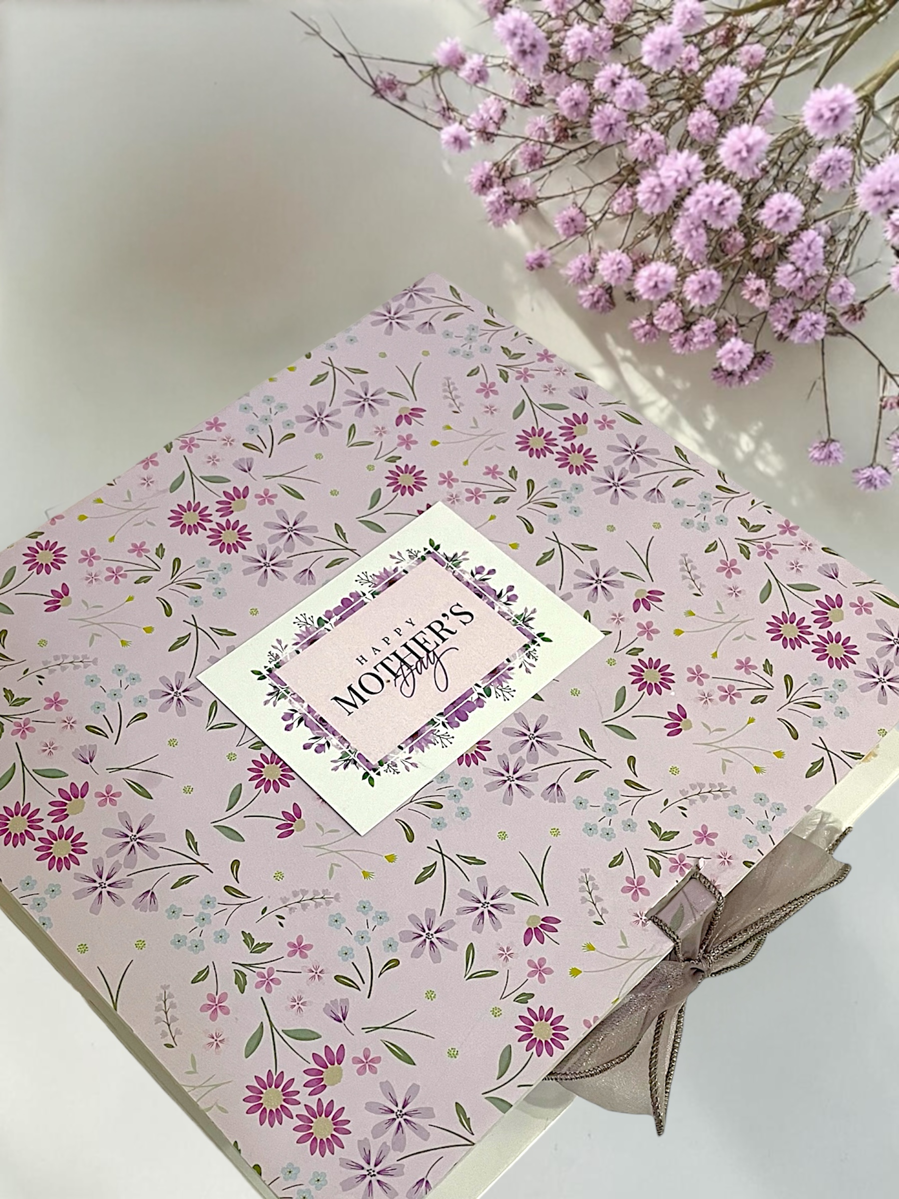 This exquisite gift features a pastel floral box adorned with delicate blossoms and a “Happy Mother’s Day” tag — perfect for expressing gratitude and affection.