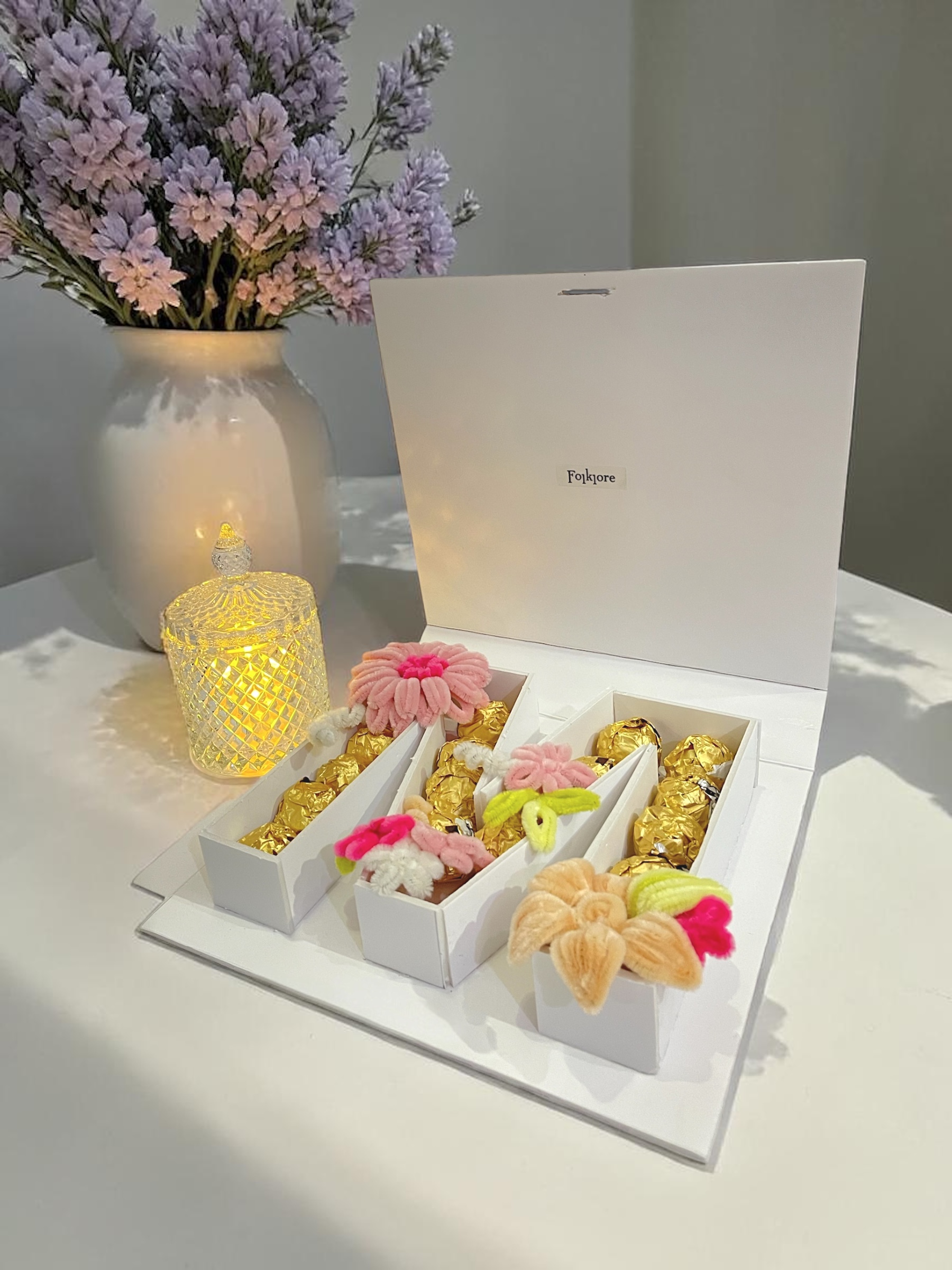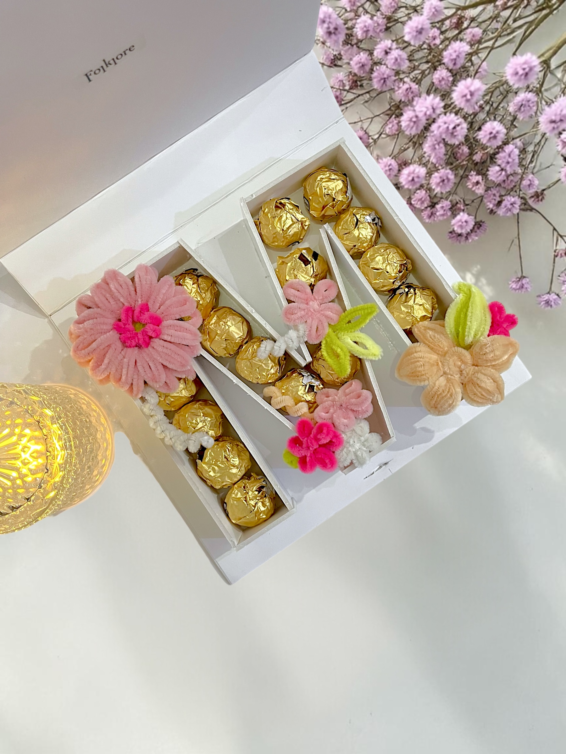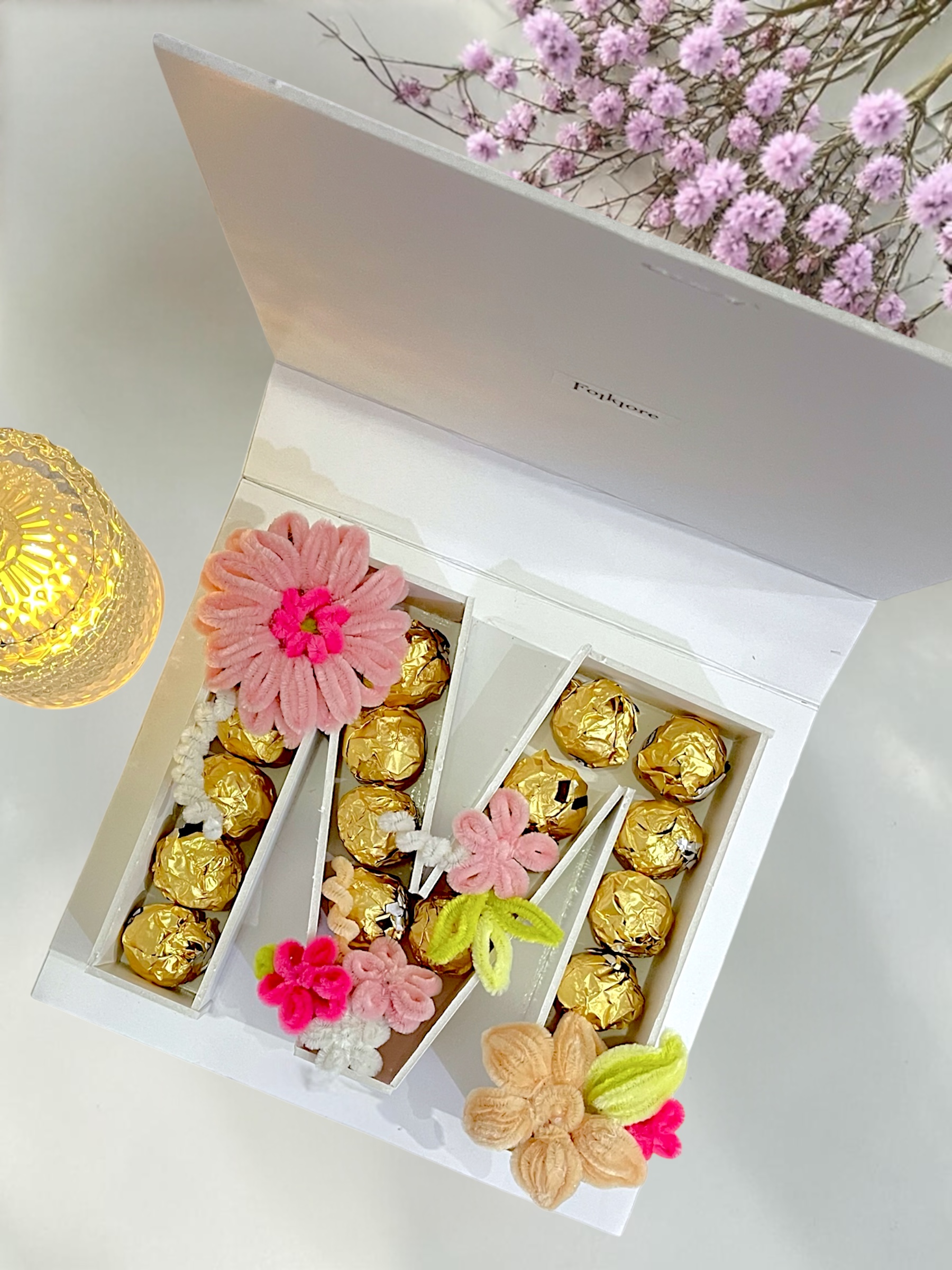 Inside, the box M letter reveal a thoughtful pairing of gold-wrapped chocolates and hand crafted flowers symbolising sweetness and grace..